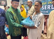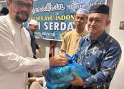 Ketua PD Mabmi Deli Serdang, Ibnu Affan tampak sedang memberikan bingkisan kepada marbot masjid Asy Syuhada Galang Kota, Wak Paet.